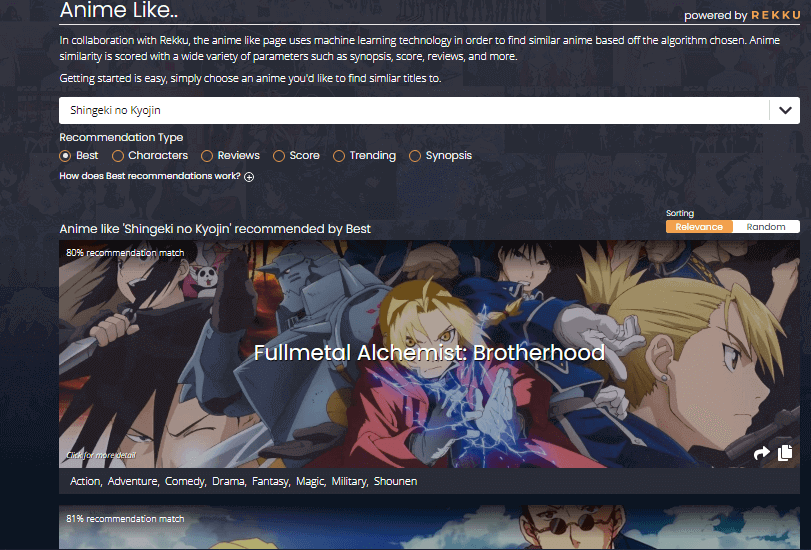 There are many options to set your preferences in this and you could generate lists based on your favorite genres or based on your AniList or MyAnimeList username or even based off another anime you already have in mind. Speaking of other anime, there’s also a page where you can generate a list of anime like an anime that you already love.